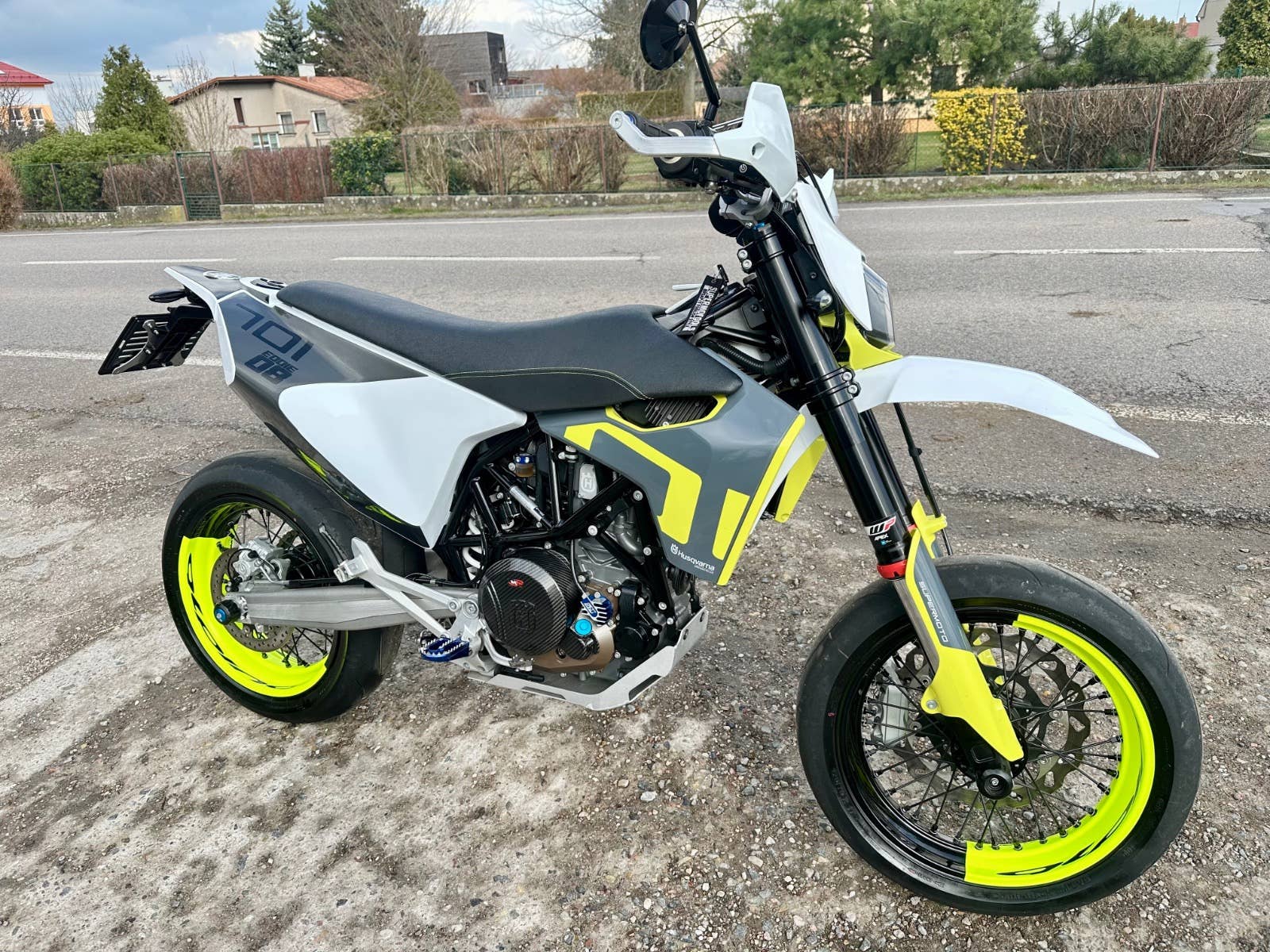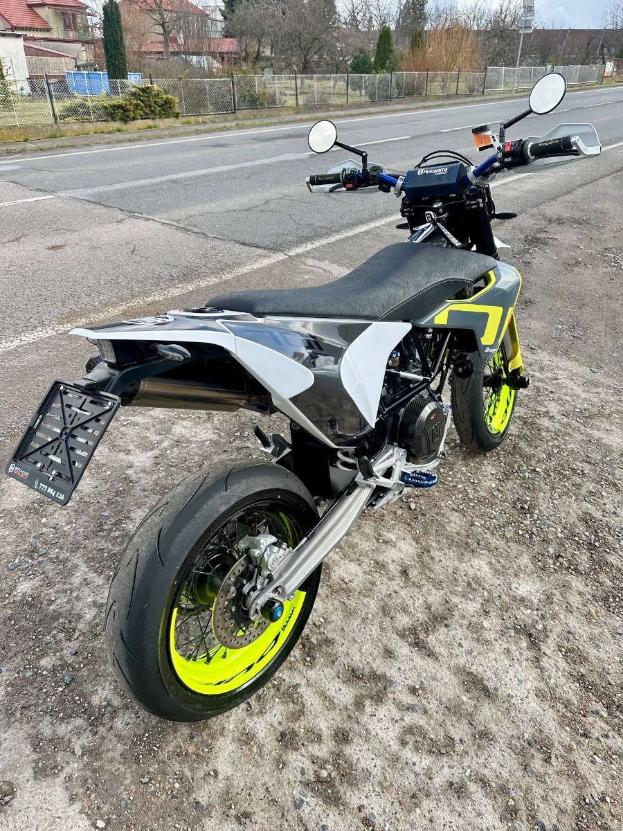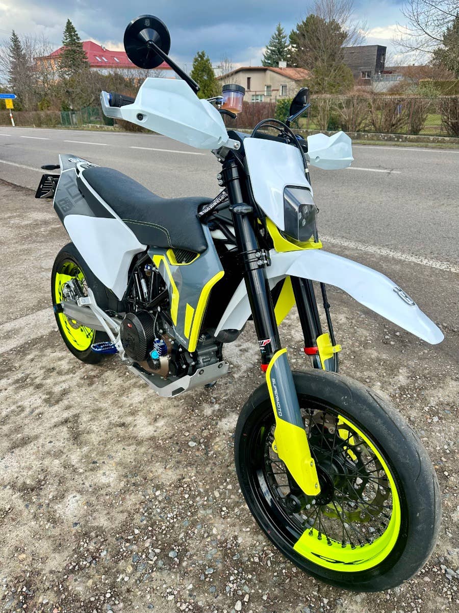 usqvarna 701 supermoto, 2020, najeto pouze 1200 km - stav nového motocyklu, 1. majitel, bez vad, majitel pořídil mnoho doplňků na motocykl- doplňkové led světlo, laděný výfuk Arrow včetně kompletního svodu a vložky, kryty rukojetí, zrcátka, sedadlo, karbonové kryty motoru, stupačky, kryt malého kolečka a karbon kryt řetězovky, doplňkový držák SPZ, víčko nádrže, ochranné polepy, protektory na osy kol, dvoubarevný drátěné kovaná kola Aplina bcolor za cca 50 tis Kč, víčko olej filtru, hliníkový kryt motoru, brzdový třmen a racing kotouč, radiální Pumpa brembo, řidítka, ochrana klemů, karbonový kryt rámu, atd ve výbavě přes 100 tis Kč+, možnost úvěru od Essoxu nebo Cofidis, stav zánovní motorky s úžasnými doplňky