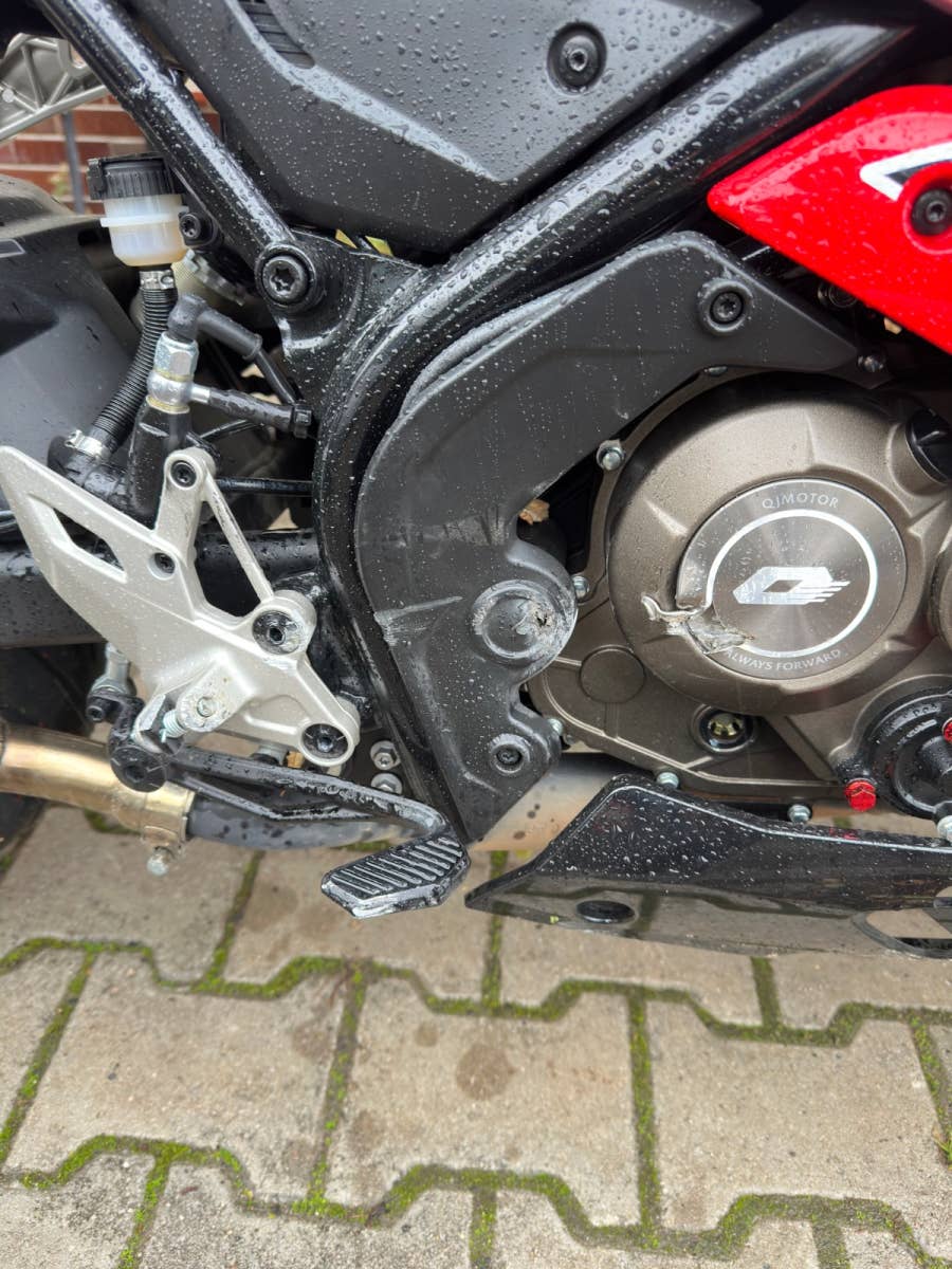 Qj motor 125 r, 2025, najeto 3 tis km, nová v Cz, 1. Majitel, motocykl lehce položený - páčka brzdy, Stupačka a kosmetika, po zakoupení nové páčky a stupačky plně funkční a pojízdný motocykl, možnost úvěru od Essoxu nebo Cofidis