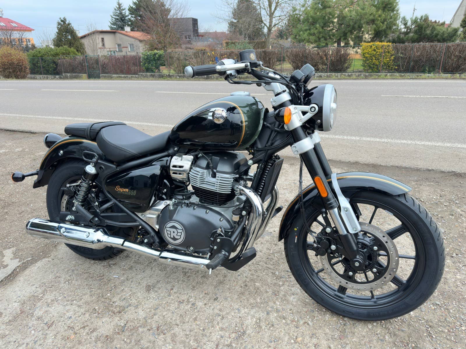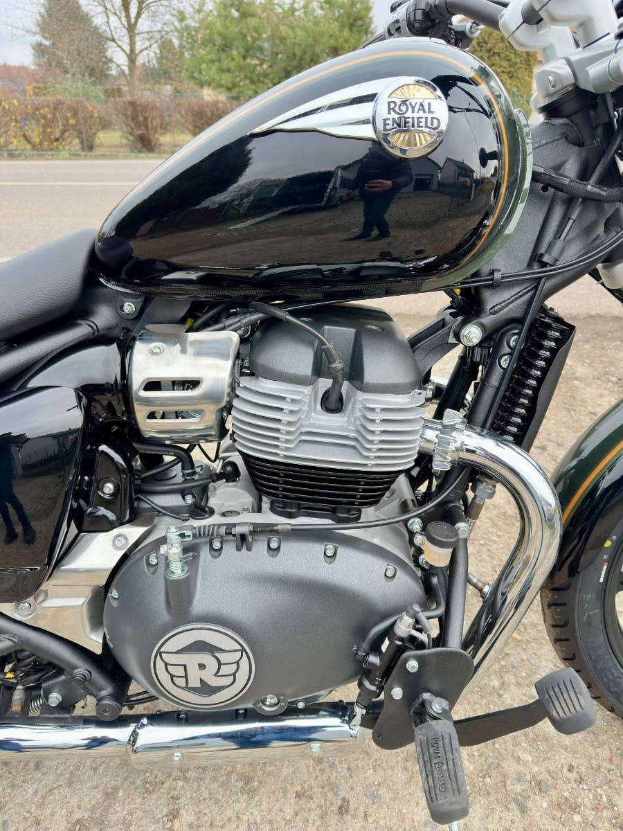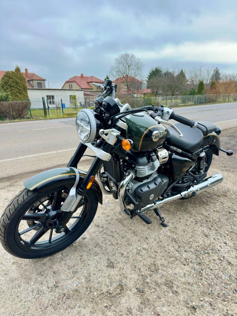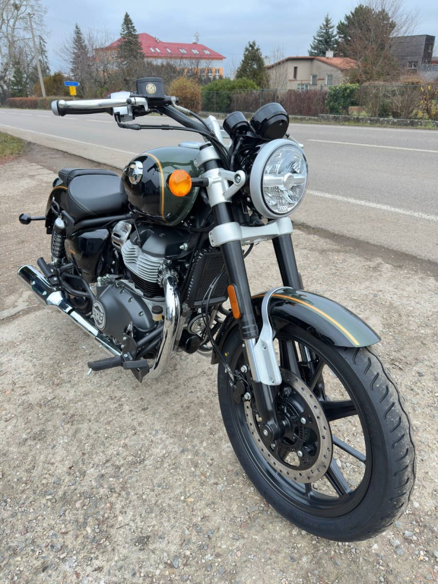 Royal enfield Super meteor 650, nový zatím neregistrovaný motocykl, k motocykl Coc list k první registraci, o 40tis levnější moto, kompletní příbal - zrcátka, držák SPZ, baterie, motocykl je pouze vyvalený z převozního rámu, došlo k pádu předmětu na přepravní rám viz foto, poškození - vryp na řídítku a klemu motocyklu viz foto, jinak absolutně bez poškození
