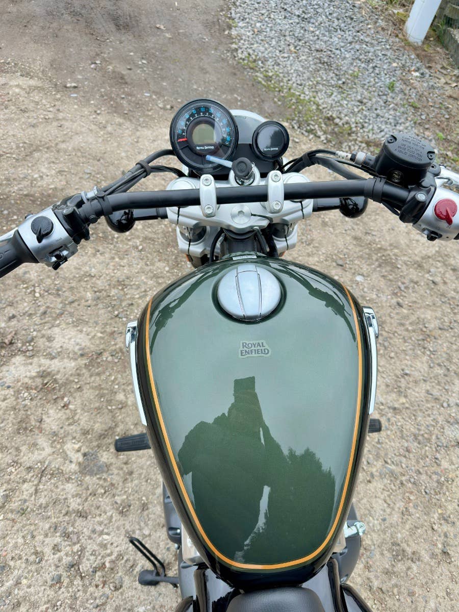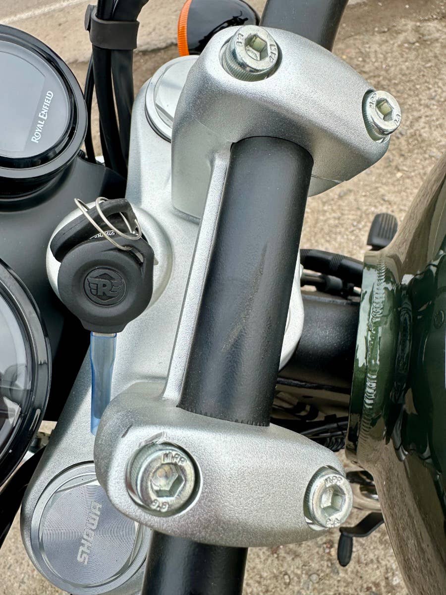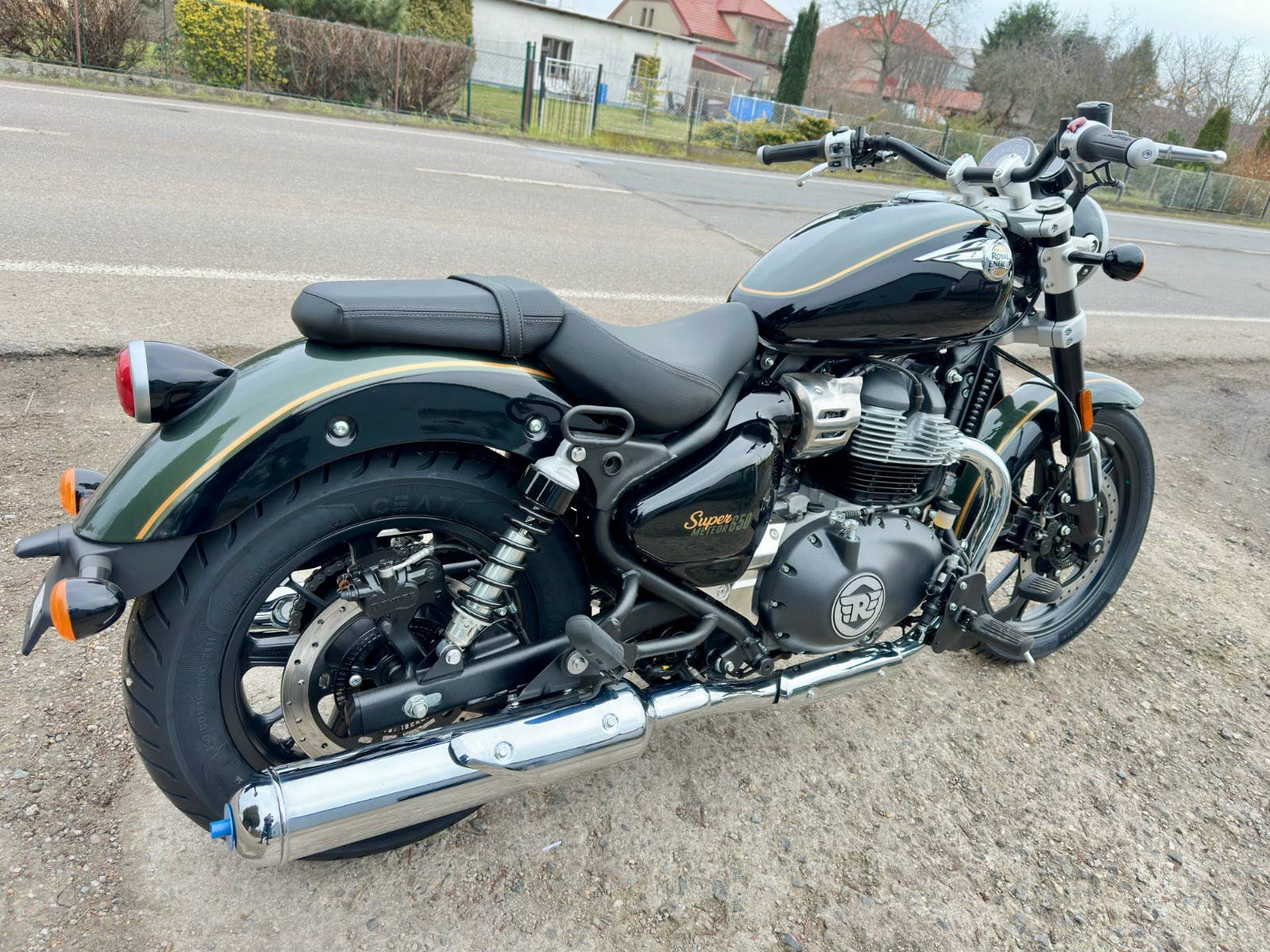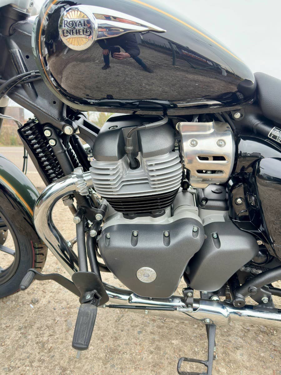 Royal enfield Super meteor 650, nový zatím neregistrovaný motocykl, k motocykl Coc list k první registraci, o 40tis levnější moto, kompletní příbal - zrcátka, držák SPZ, baterie, motocykl je pouze vyvalený z převozního rámu, došlo k pádu předmětu na přepravní rám viz foto, poškození - vryp na řídítku a klemu motocyklu viz foto, jinak absolutně bez poškození