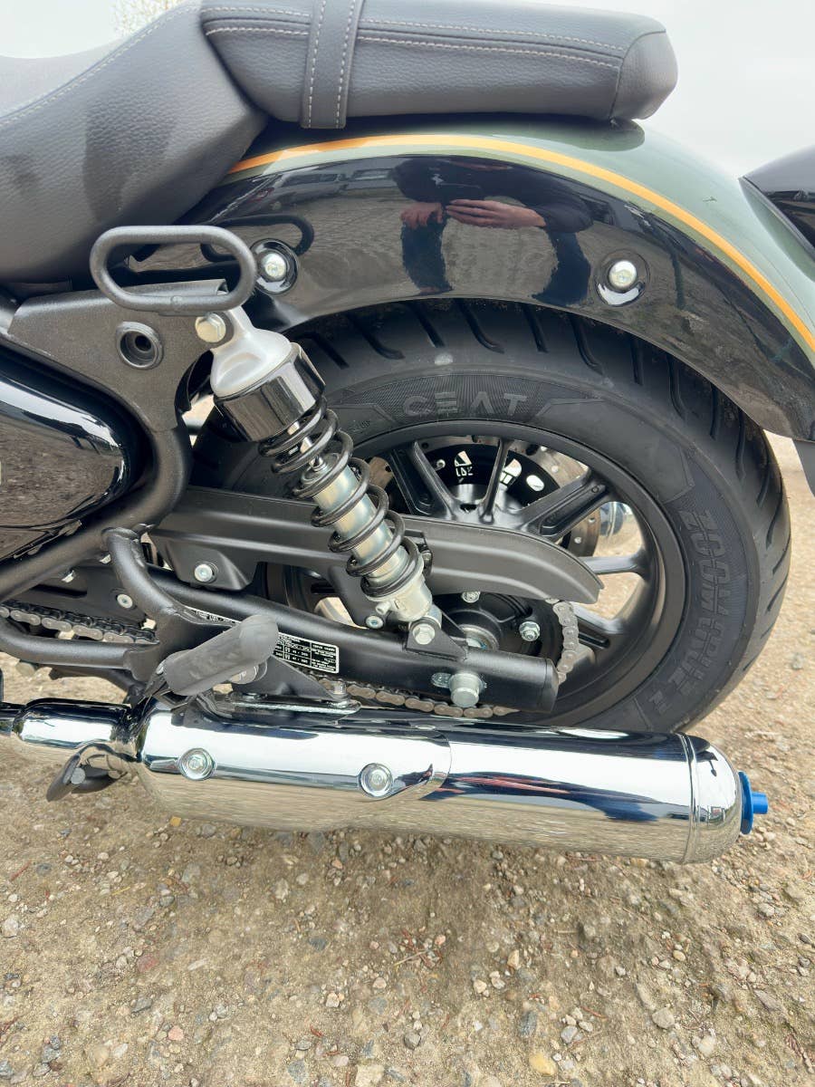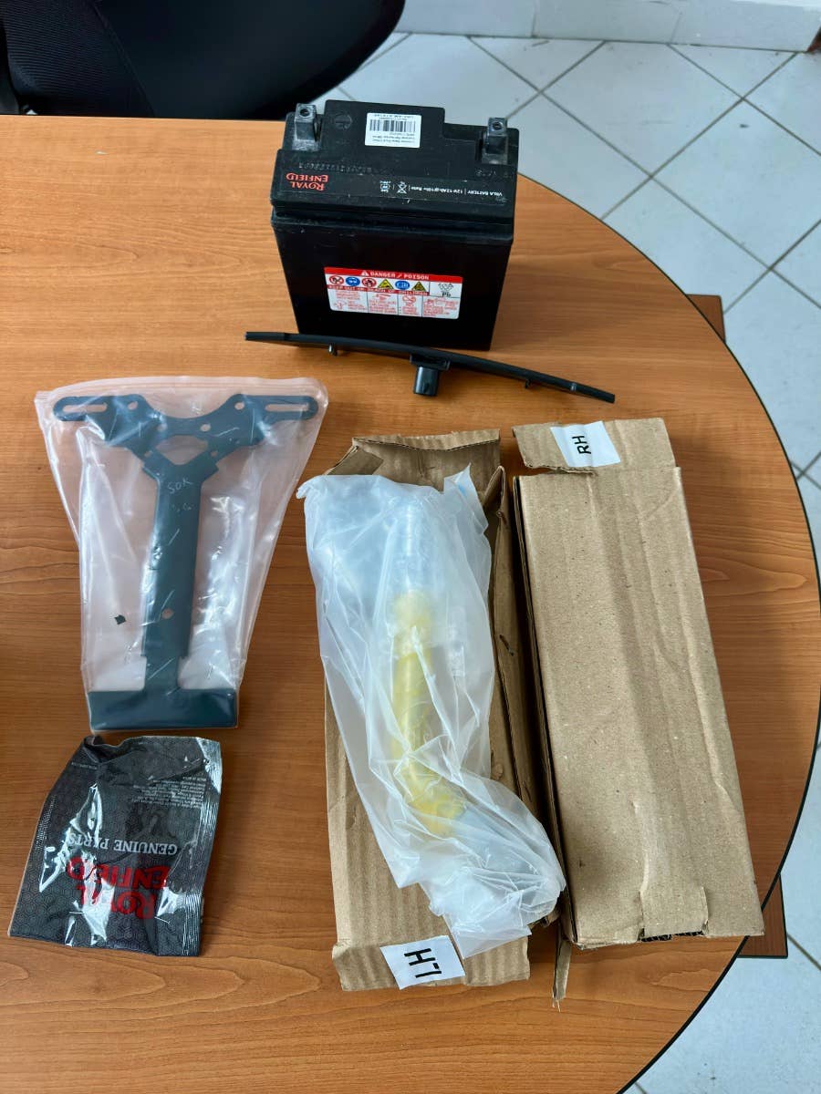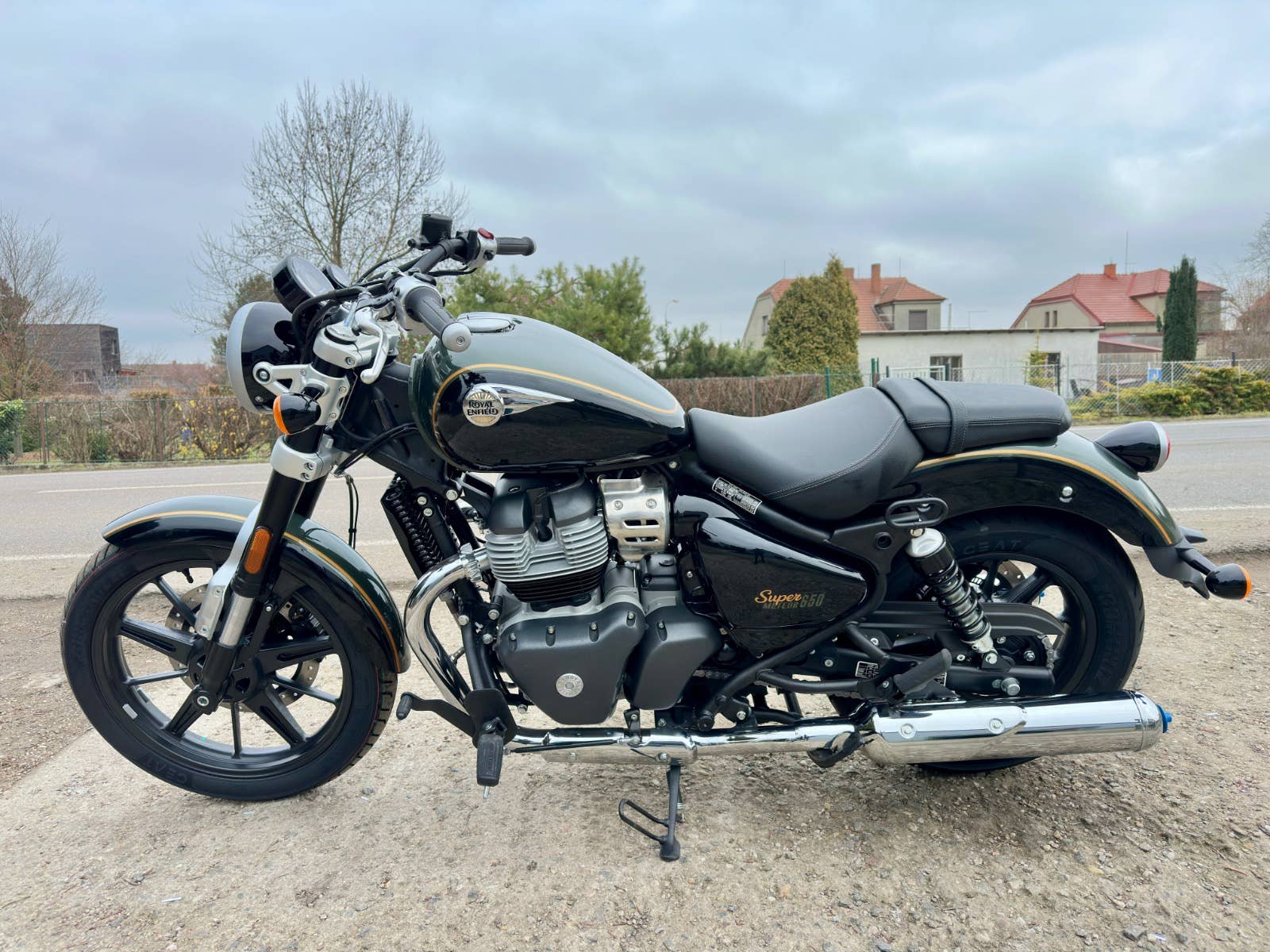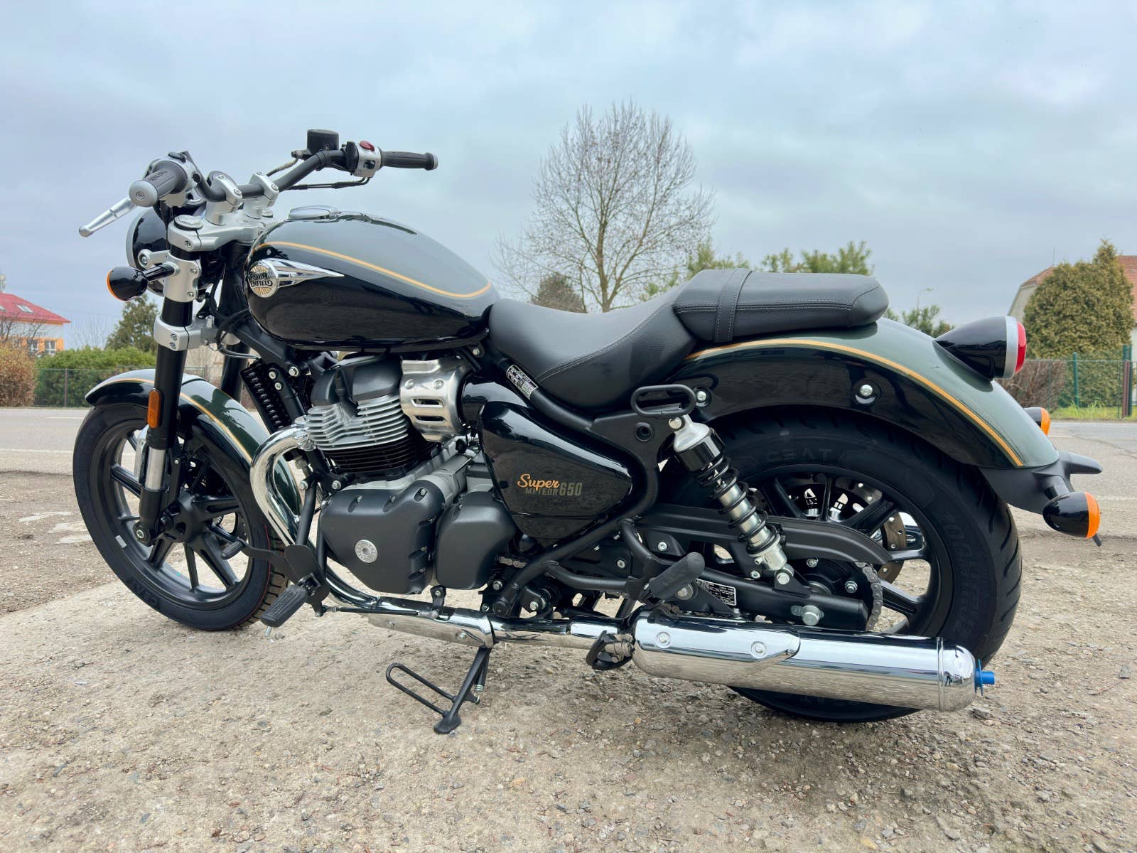 Royal enfield Super meteor 650, nový zatím neregistrovaný motocykl, k motocykl Coc list k první registraci, o 40tis levnější moto, kompletní příbal - zrcátka, držák SPZ, baterie, motocykl je pouze vyvalený z převozního rámu, došlo k pádu předmětu na přepravní rám viz foto, poškození - vryp na řídítku a klemu motocyklu viz foto, jinak absolutně bez poškození