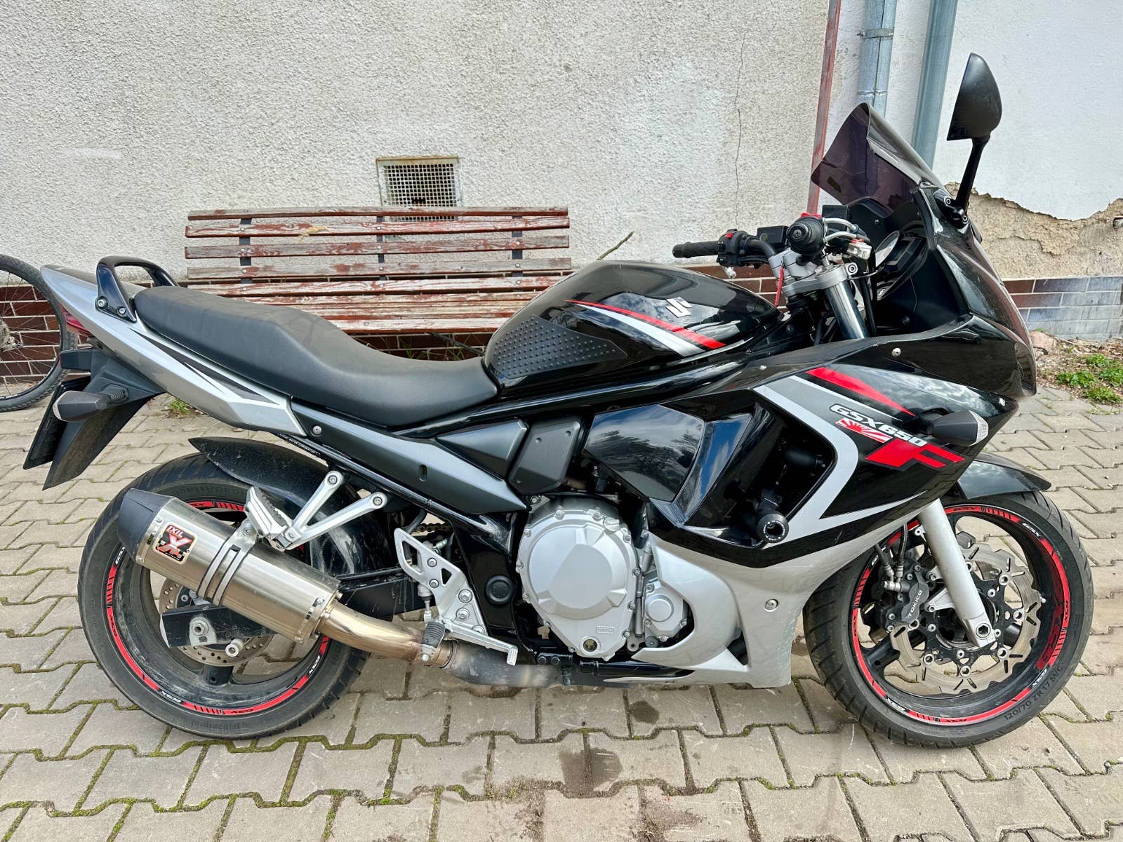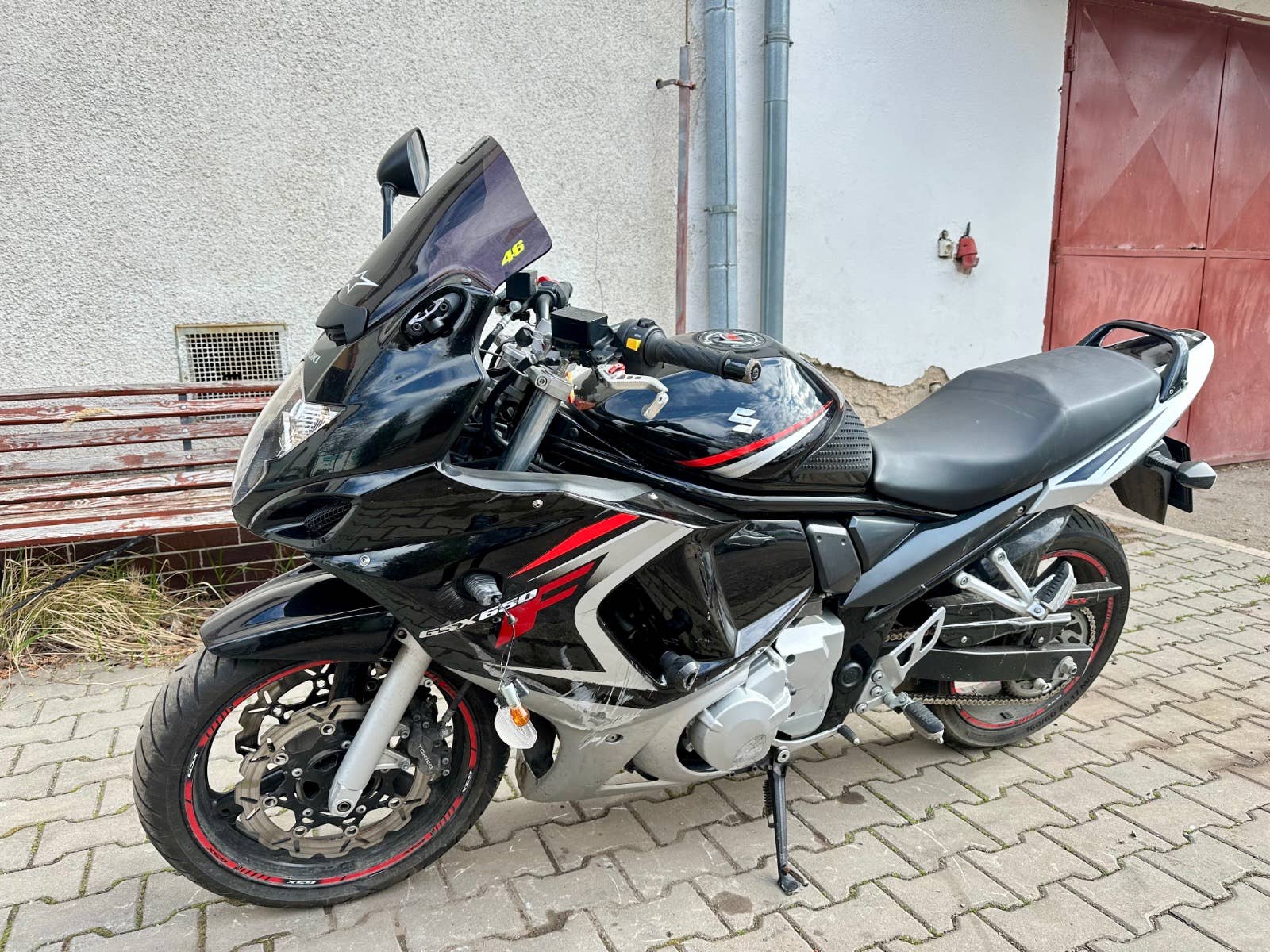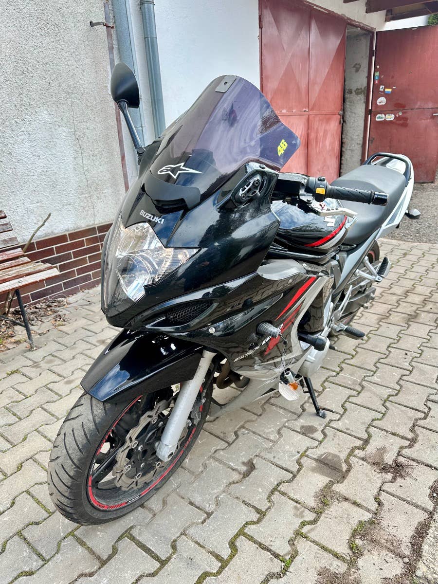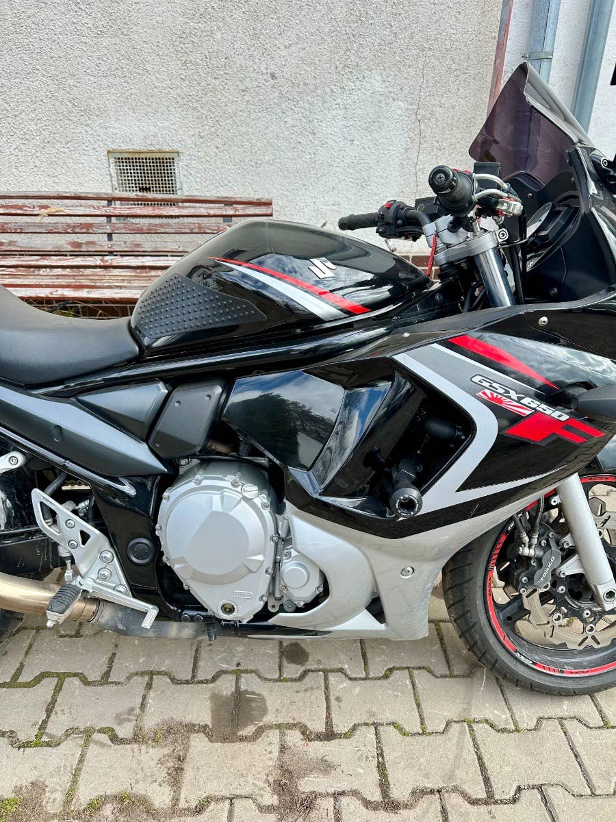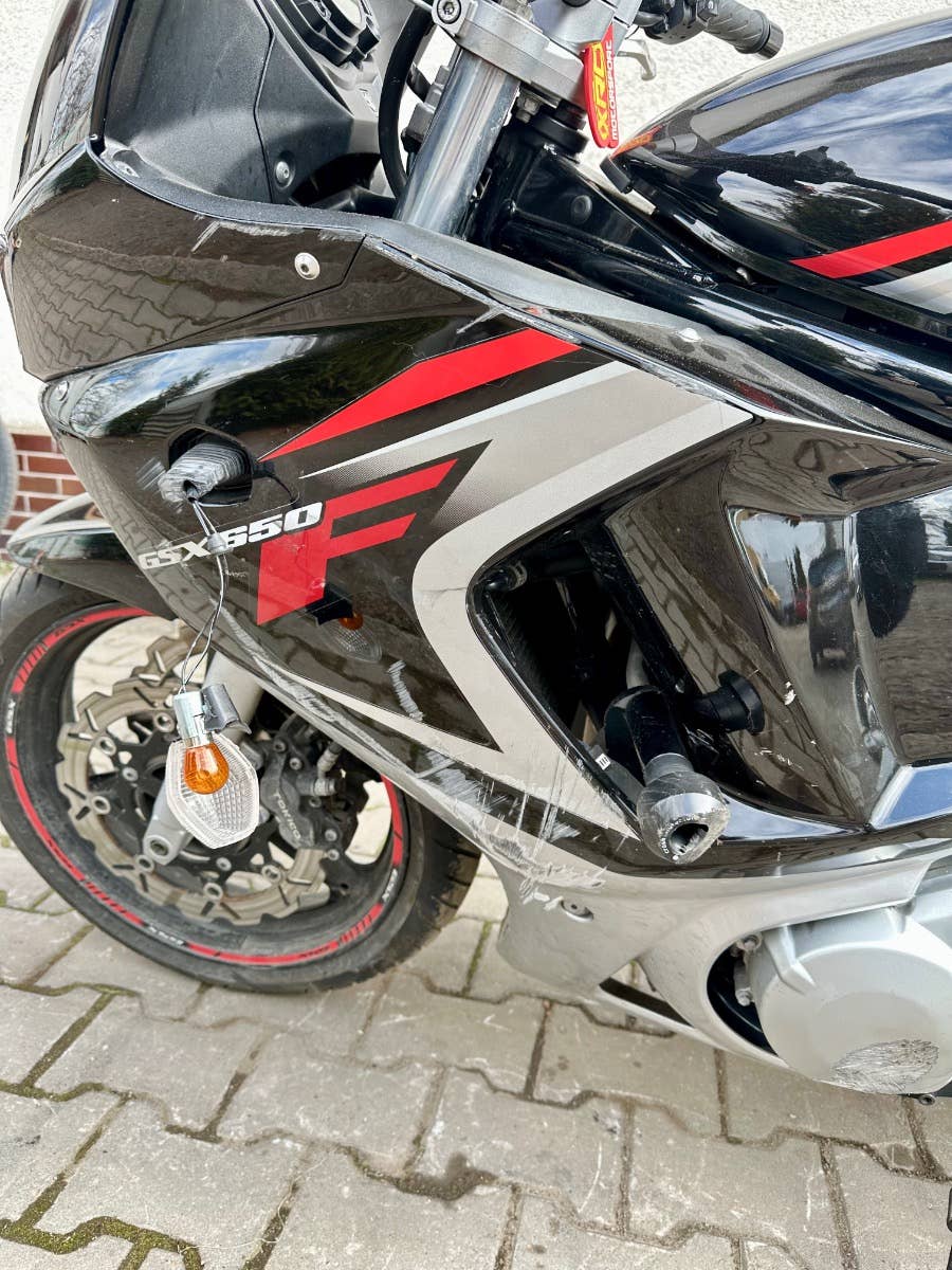 Suzuki gsx 650 f, 2008, najeto 46 tis km, v TP 35 kW lze řídit od 18-ti let, lehce položená na levou stranu, blinkr, řidítko, zrcátko, kapota odřená, prakticky pojízdný motocykl, možnost úvěru od Essoxu nebo Cofidis
