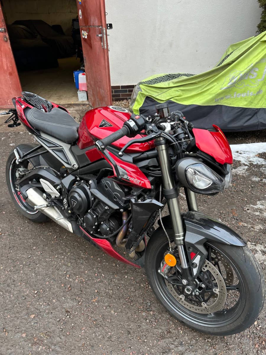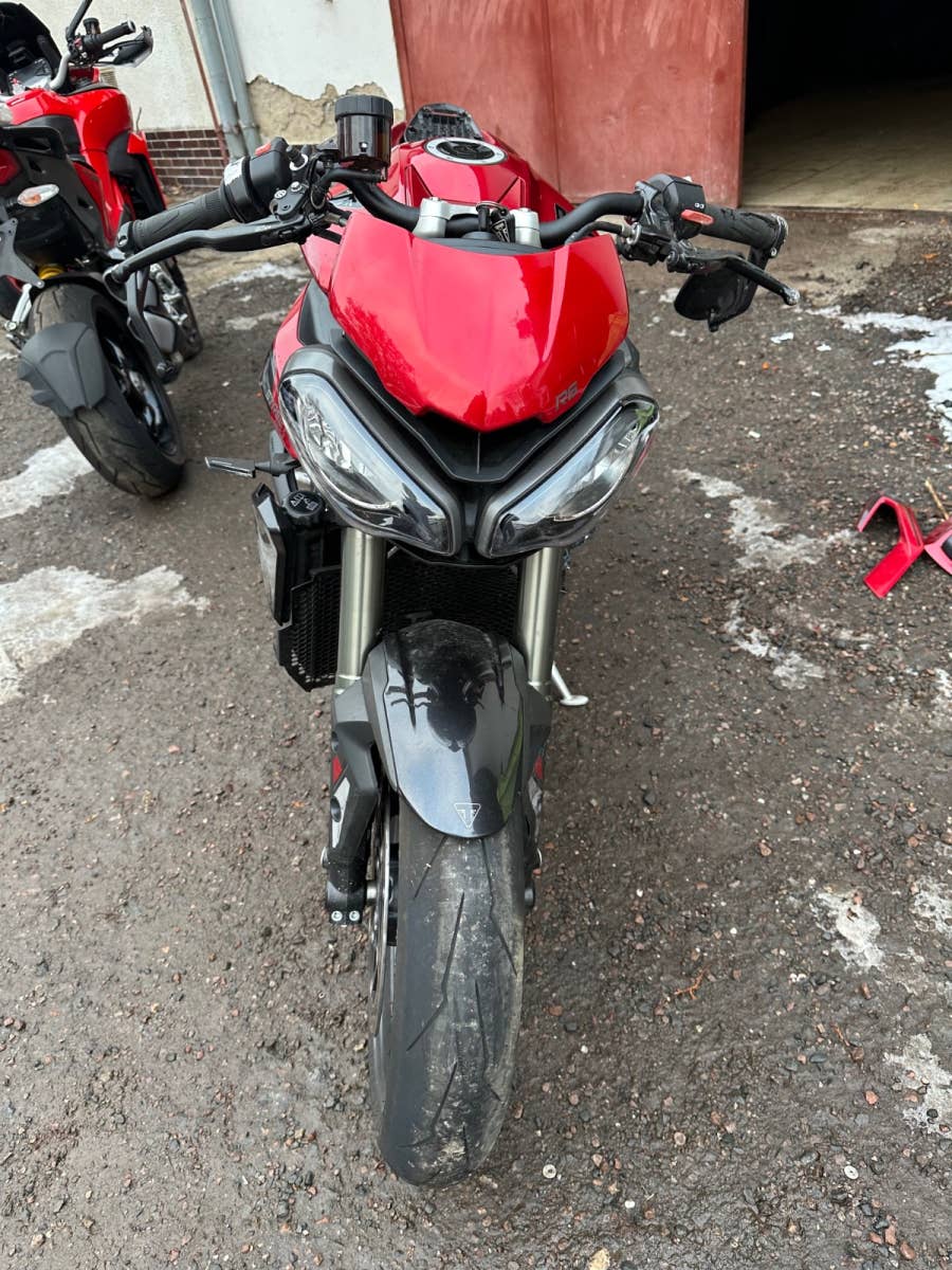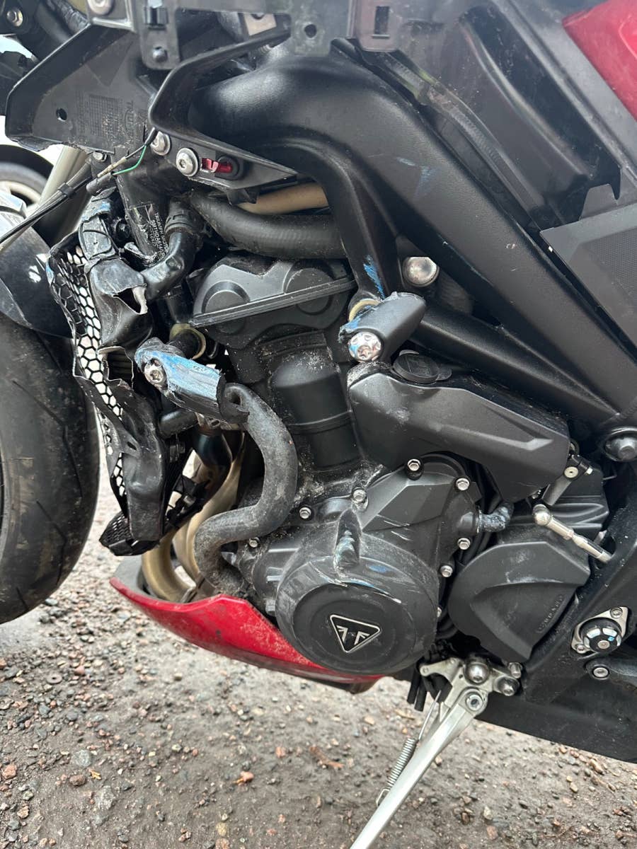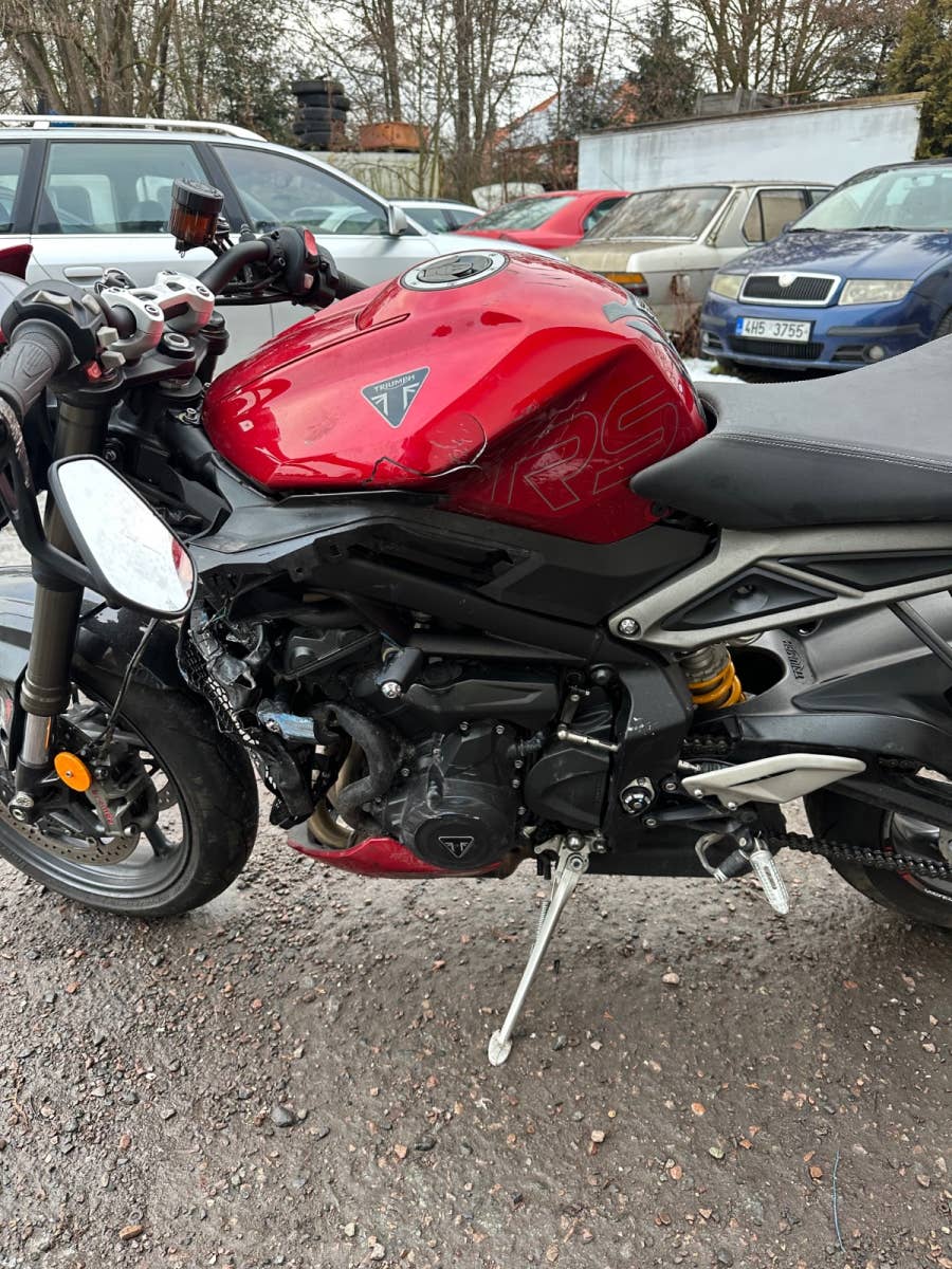 Triumph street triple Rs, 2024, najeto cca 3 tis km, havarovaný viz foto, podvozek je ok, motor ok, budiky a světlo ok,. Možnost úvěru od Essoxu nebo Cofidis